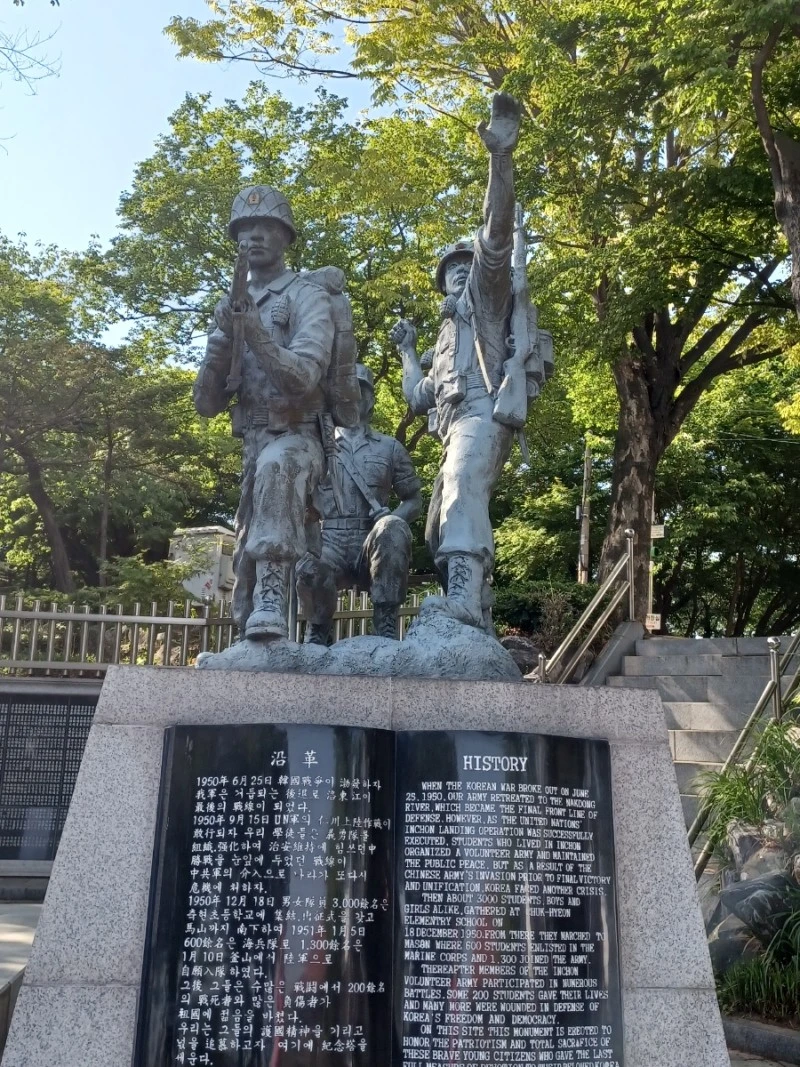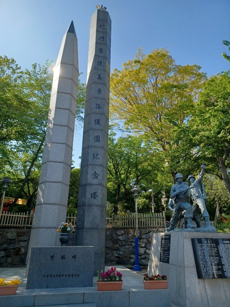 자유공원에서 처음 마주한 풍경은 우뚝 치솟은 인천 학도의용군 호국기념탑과 결기 어린 표정의 젊은 군인 동상이었다.