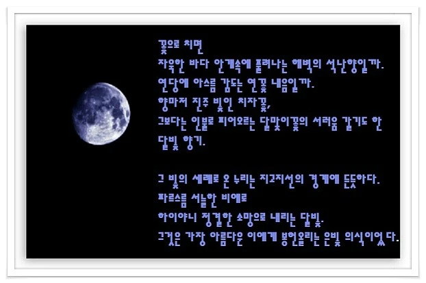 빛의 세례로 온누리는 지고지선의 경계에 든 듯하였다. 파르스름 서늘한 비애로, 하이야니 정결한 서원으로 쏟아져내리는 달빛. 그것은 가장 아름다운 이에게 봉헌 올리는 은빛 의식이었다. 세세히 결 고운 달빛은 그늘에서도 티 없이 투명했고 남루한 도시의 외곽에서도 여전히 청청했다. 더하여 빛줄기 하나하나가 경건한 성소(聖所)로 느껴지기조차 하는 달밤이었다. 작은 등불 밝혀든 테레사 수녀처럼 그렇게 낮은 키로 내리는 달빛. 달빛에 오롯이 감싸 안긴 밤, 모성의 가슴이듯 무한한 안식감에 젖어들며 나른함에 빠져들어갔다.