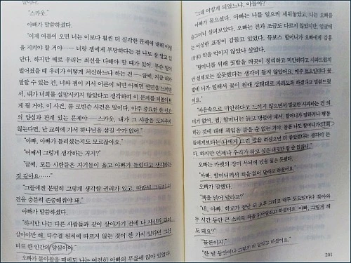 그만큼 몰입도 최고인 책이지만, 후딱 읽어 치울 수 없을 만큼 금언 같은 대사들이 하도 숱해 밑줄 그어가며 꼼꼼스레 읽었다.
