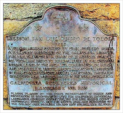 Mission San Luis Obispo de Tolosa는 주니 페로 세라 신부가 1772년에 세운 다섯 번째 미션이다. 프랑스 톨로즈 지방의 오비스포, 즉 비숍이었던 세인트루이스 오비스포의 이름을 붙였다, 루이스 주교는 나폴리 왕 찰스 2세의 아들이자 프랑스 루이 9 세의 조카라 한다. 미션의 왕자라 불리는 이 미션이 건립된 초기. 원주민들은 이주자들이 갖고 온 총이 그들을 위협해 오던 곰을 퇴치시켜 주었기에 호의적이었다. 그러나 해가 갈수록 백인 이주민이 늘어나며 점점 정복 야욕이 노골화되자 반목이 깊어졌다. 1776 년 외지인들을 몰아내고자 원주민이 쏜 불화살이 미션의 초가지붕에 떨어졌다. 삽시에 불길이 짚섶으로 옮겨 붙으며 부속 건물 전부가 불타버렸다. 이를 계기로 이후 가마에서 구워 낸 붉은 기와로 지붕을 얹으며 미션의 상징처럼 돼있는 담황색 지붕이 자리 잡게 되었다.