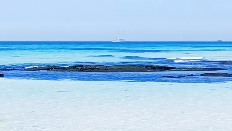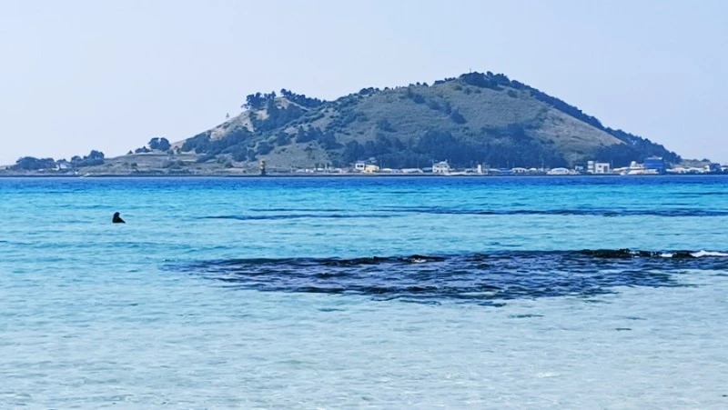 물빛이 말해주듯 처음엔 물이 아주 얕아 은모래 그대로 비치지만 저만큼 멀어진 바다는 짙은 사파이어 빛.