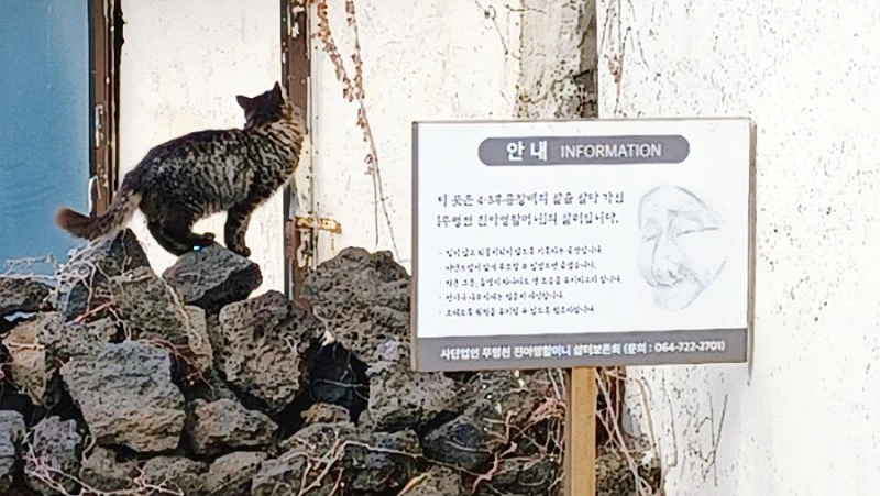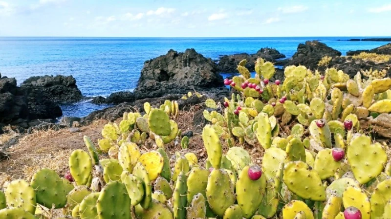 희한하게도 멕시코 산 선인장이 마을 돌담과 해변가 현무암 바위 사이에 수도 없이 뿌리내려 청남빛 바다 풍경과 어우러져 퍽 이국적이다.