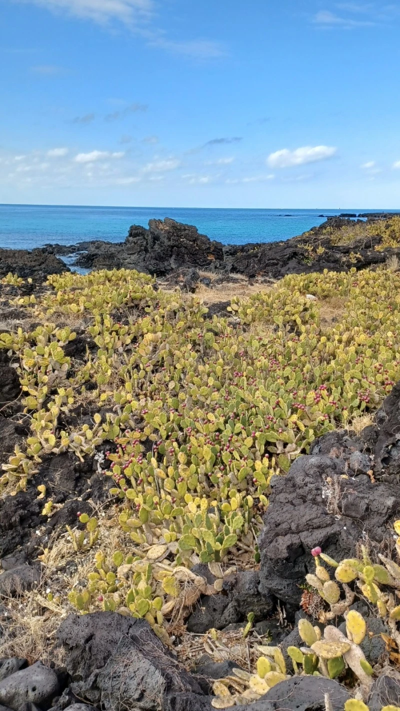 모래 대신 바닷가 시커먼 현무암 암벽 틈에 돋아나 환경에 맞춰 빗물보다 짭조름한 간기에 더 익숙하도록 적응기 거쳐온 선인장.