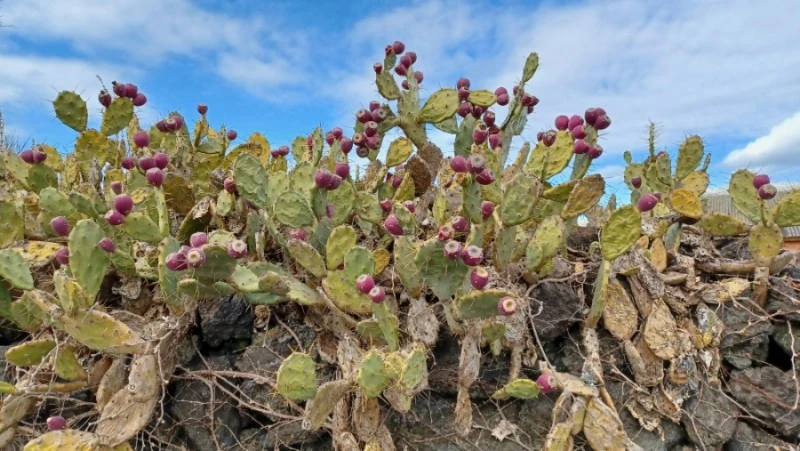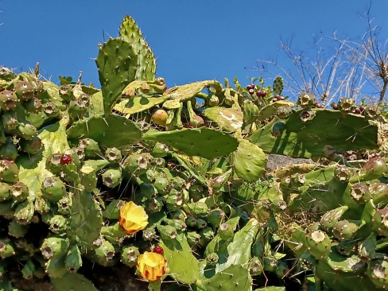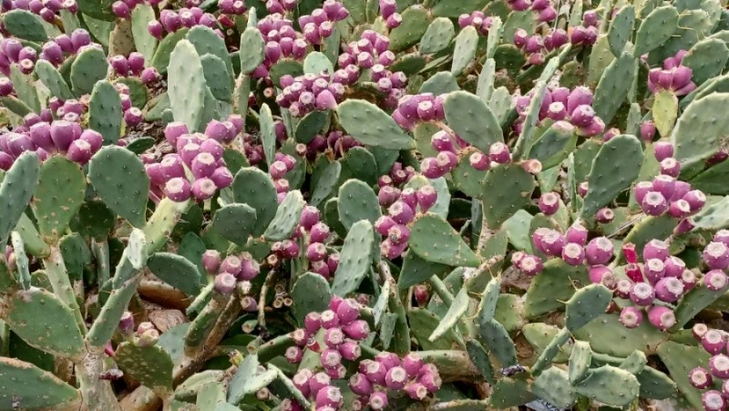 손바닥 선인장이라 부르는 이곳 선인장은 여름철에 노란색 꽃이 피었다가 꽃 진 자리에 자줏빛 열매가 맺힌다.