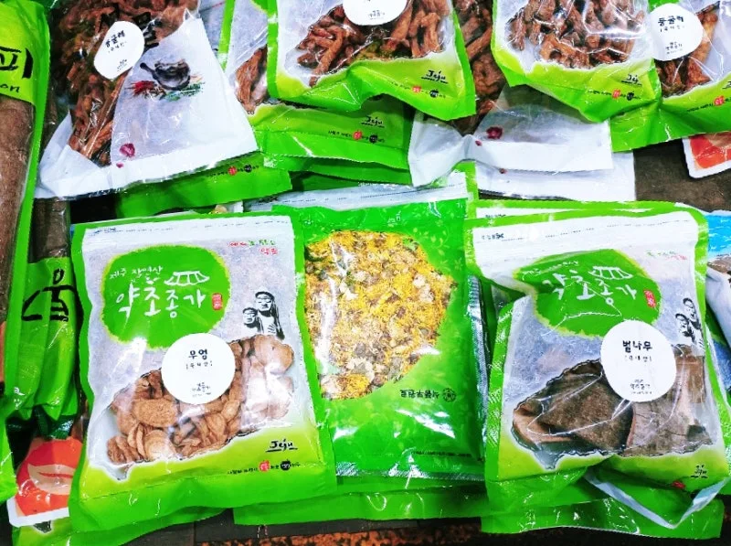 한참 서서 어성초, 방풍 뿌리, 졸참 나뭇잎, 우슬 같은 마른 약제들도 구경했다.
