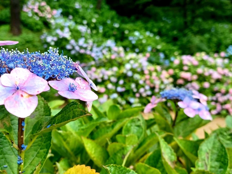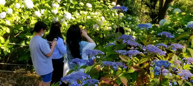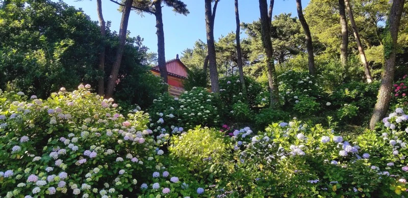 청보라색, 자색, 분홍색, 흰색, 빨간색의 꽃이 핀다. 꽃은 처음엔 노르스름한 흰색으로 피기 시작하지만 점차 청색이 되고 다시 붉은색을 더하여 나중에 보라색으로 변한다. 지조 없다고 나무람받아도 할 말 없겠다. 아무튼 시시각각 그 조화가 변화무쌍하다. 전국적으로 알려진 수국 명소는 부산 태종사 수국이다. 삼천 그루가 넘는 수국이라니 아예 수국 밭이고 수국 언덕이다. 해마다 칠월이면 수국축제가 열린다고 한다. 축제에 앞서 태종사 유월 수국을 보러 왔다. 아직 제철이 아니라도 꽃을 담으려는 사진작가와 관람객이 제법 많았다. 무뜩 '하나의 마음도 주체하지 못해서/들었다 놓았다, 풀었다 맺었다 하루에 열두 번도 더/변덕을 부리다가, 꽃의 몸을 빌려 빵반죽처럼 부풀어도 되는지...' 최정란시인의 수국꽃 시가 떠올랐다.