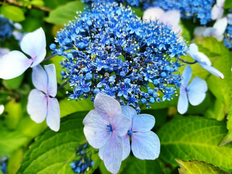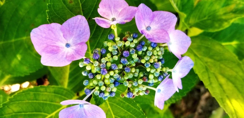 멀리서 수국 언덕을 바라보면 한 덩어리 꽃송이가 마치 각각 한 송이의 꽃처럼도 보인다. 너른 터에 자리 잡아서인지 전체적으로 풍성하고 넉넉하면서도 소담스럽다. 신부 부케로도 선택받는 수국꽃, 꽃 하나를 찬찬히 들여다보노라면 어느 부위가 진짜 꽃인가 싶다. 원래의 꽃 자체야 작은 꽃잎은 물론 수술과 암술이 퇴화하여 몽글몽글 오글오글 모여있어 볼품이 없다. 그 모양으로는 더구나 향기도 없으니 눈여겨볼 리 만무다. 이에 신의 섭리라는 절묘한 수가 개입한다. 생존전략상 곤충을 부르려 나비 같은 가짜 꽃잎을 스스로 만들게 하는데 이는 꽃받침이 변형된 것이라 한다.