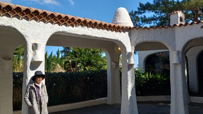 담황색 기와지붕에 거칠지만 하얗게 회칠한 벽체, 둥근 창이며 곡선으로 굽이 튼 회랑 우아하다.