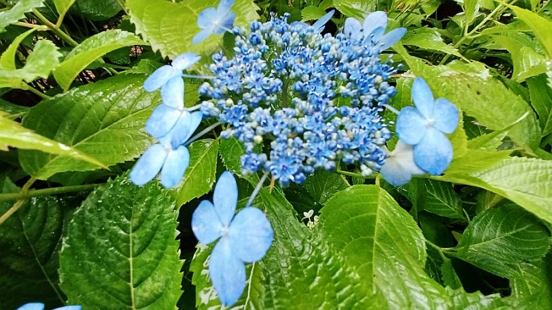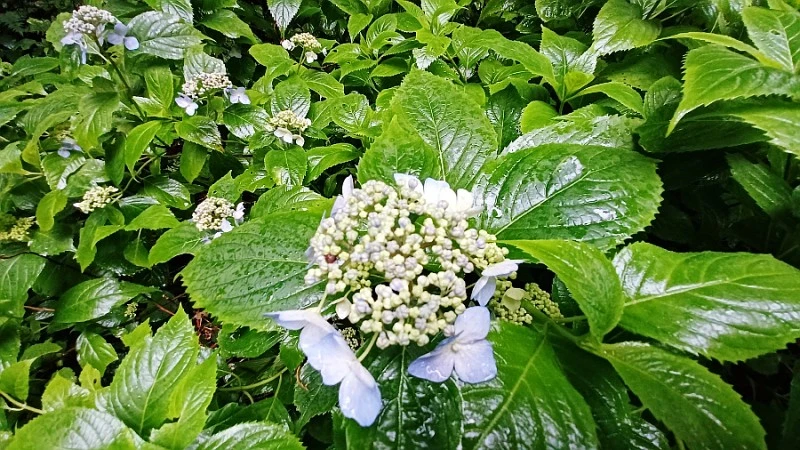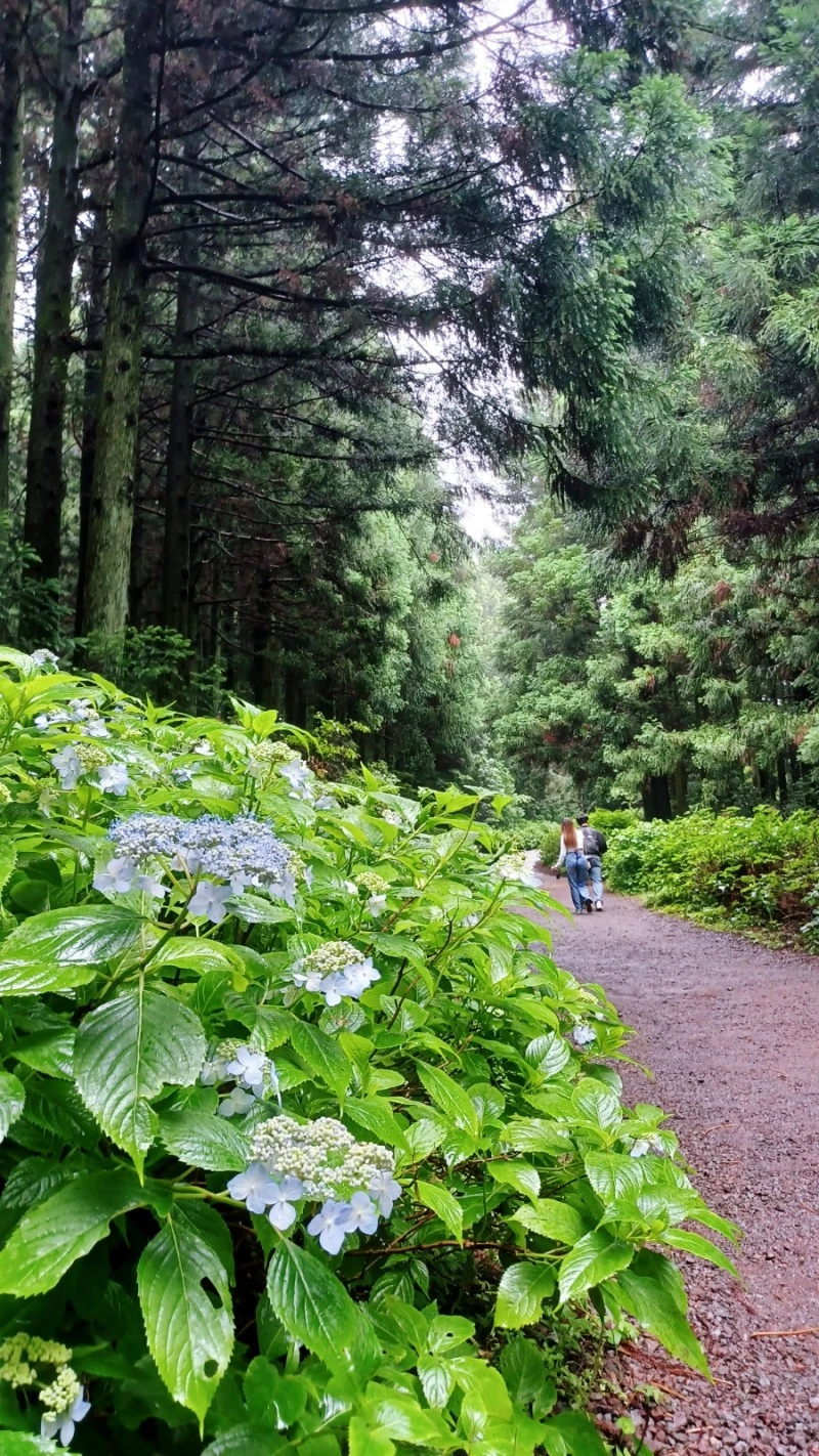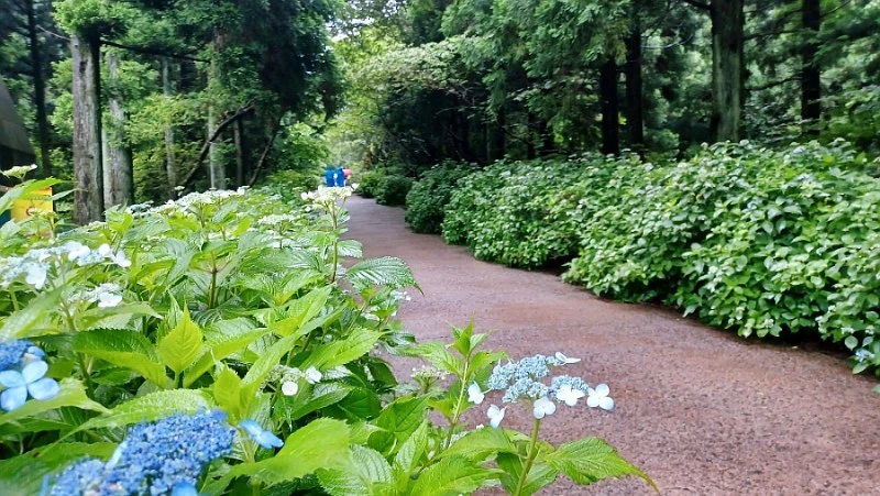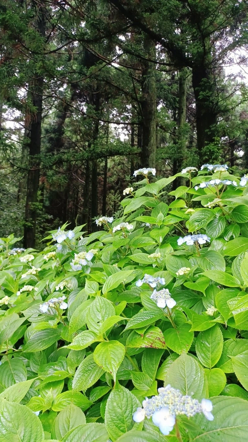 숲길 양 가에 수북하게 심어진 산수국 마악 물빛 꽃잎 피어나고 있었다.