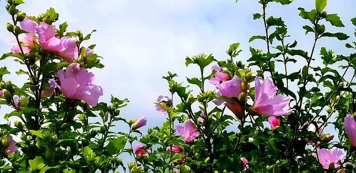 초대받은 교우 집에 가보니 꽃대궐이 따로 없다. 진주홍 능소화 휘늘어져있고 자귀나무꽃 부채춤사위가 우리를 환대한다. 곧이어 배롱나무꽃도 벙글 것이다. 게다가 울타리 둘레에는 반가운 꽃이 피어있다. 무궁화다. 하와이 무궁화라 불리는 화려한 히비스커스가 아니라 조신한 ‘우리’ 무궁화다. 흰색도 있고 청보라도 있다. 저절로 끌리는 피붙이의 당김 같은 것인가. 무궁화에 건네지는 눈길이 그윽하니 유정하다. 나라꽃이라서 사뭇 각별한 것이다.