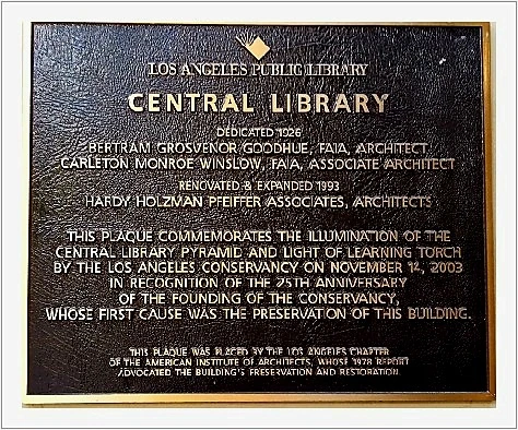1926년에 개관한 중앙도서관은 67년 LA 시 문화재 관리국으로부터 시 사적지로 지정되었으며 1970년에는 사적물로 지정됐다.