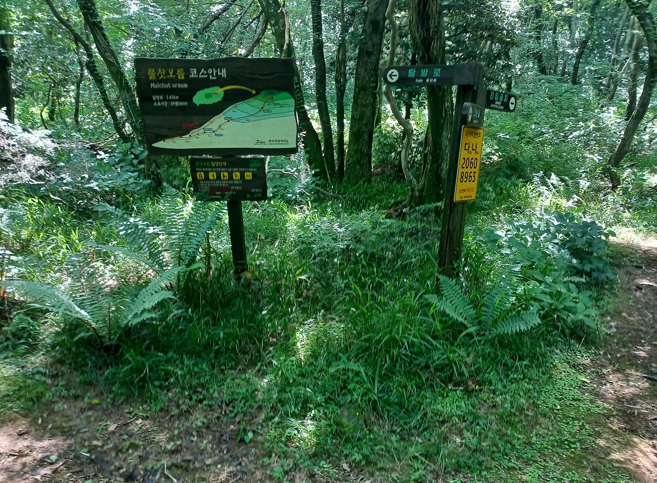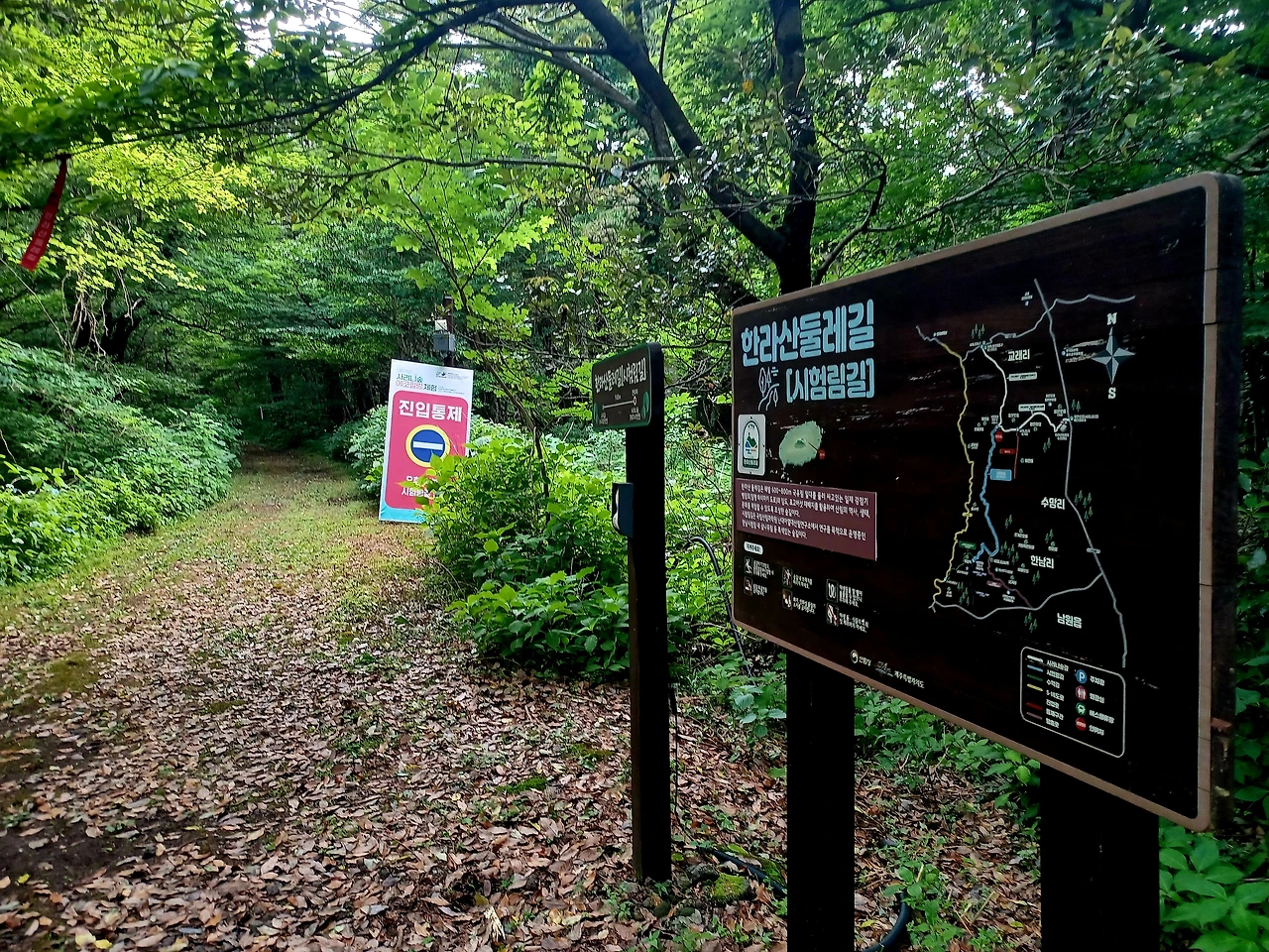 사려니숲 산수국길 따라 한 시간여 걷다 보면 만나는 삼거리 좌측은 한라산 둘레길, 우측은 물찻오름길이다.