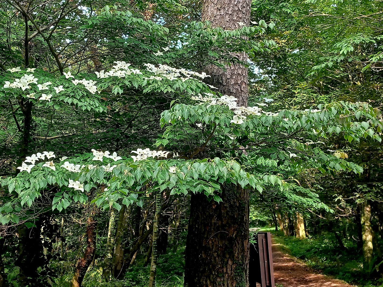 흔한 산딸나무는 하나같이 하늘 향해 하얀 네 장의 꽃잎 펼치고 촘촘 어우러졌다.