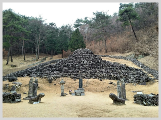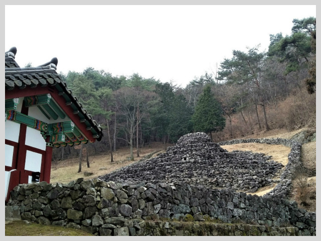 이끼 낀 무지개다리 건너 산비알, 국내 유일의 석총인 돌무더기 소복 쌓인 구형왕릉이 보였다.