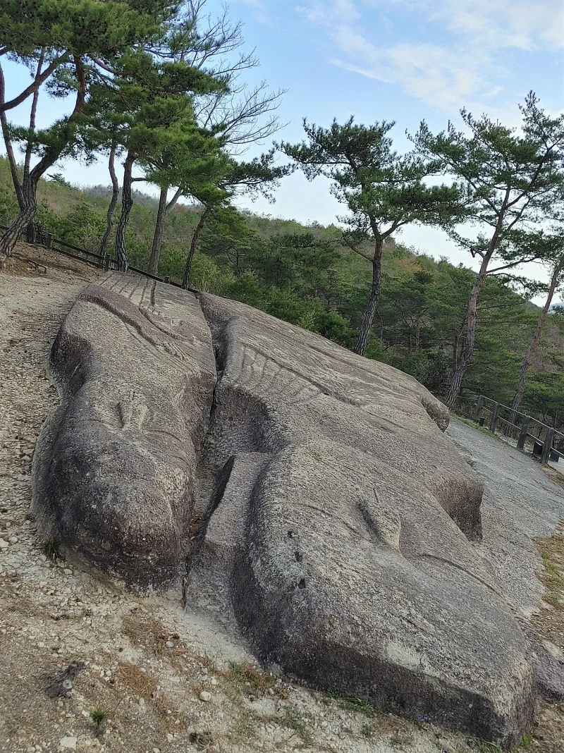그중 놀랍게 새겨진 건 미처 일으켜 세우지 못해 암석으로 붙박인 채인 와불이다. 입체감 없이 담담한 표정이야 운주사 여느 불상과 마찬가지이나 두상(頭像)만도 얼추 내 키 가까운 크기에 양손 오롯이 합장하고 누운 부처님 두 분. 자연 암반에 그대로 함께 조각된 채다. 그 마지막 두 불상을 완성시켜 세우려는 찰나, 새벽닭 울며 무위로 끝나고 마는 백제 유민의 꿈.