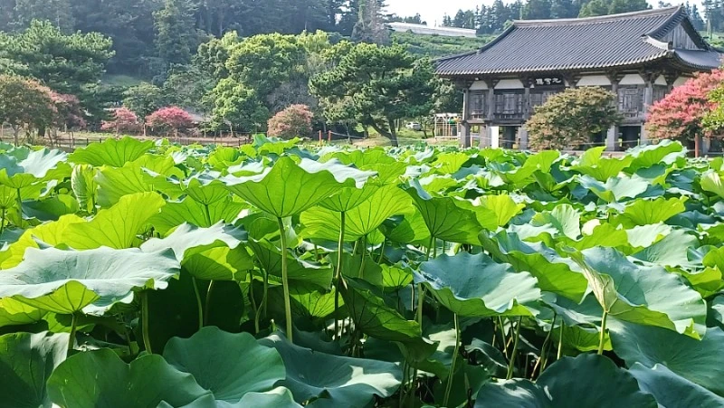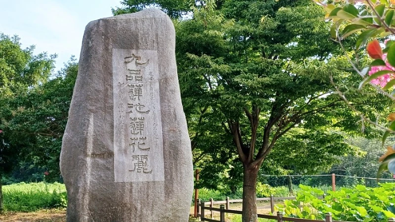 구품 연지에 피어있는 연꽃과 연지를 둘러싼 수목들로 장관 이룬 사찰 모습 상상하니 동계가 일었다.