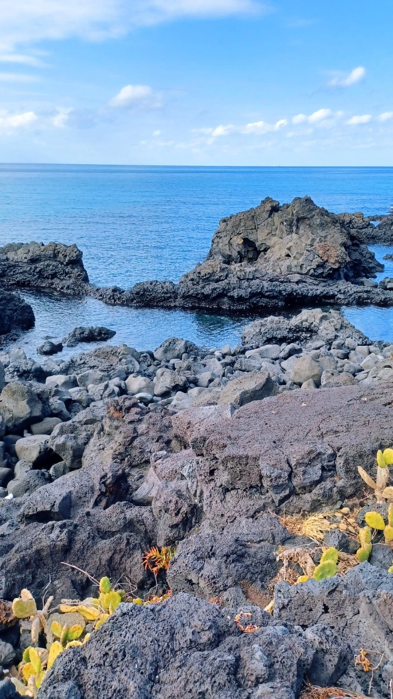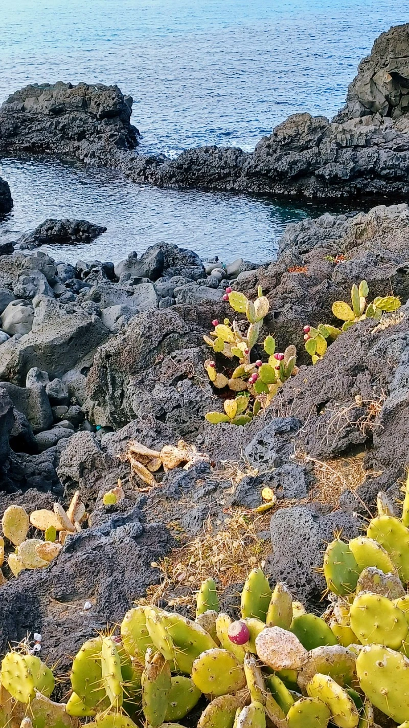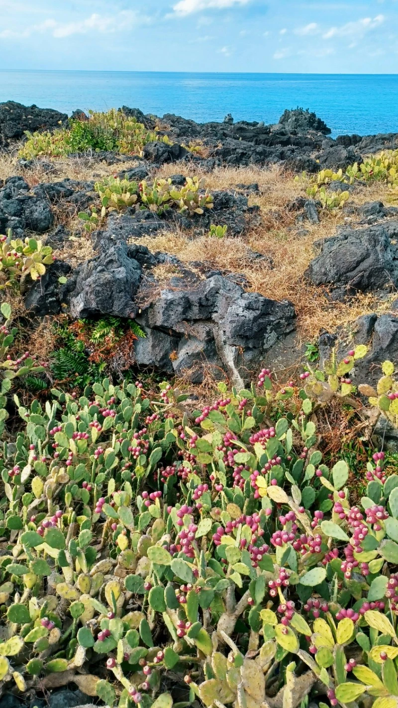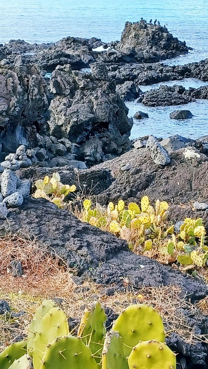 희한하게도 멕시코 산 선인장이 해변가 현무암 바위 사이에 수도 없이 뿌리내려 청남빛 바다 풍경의 일부가 되었다.