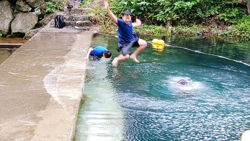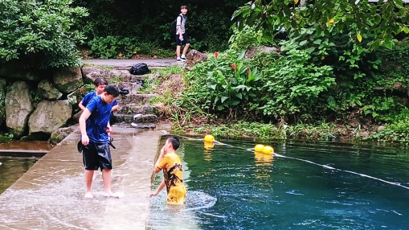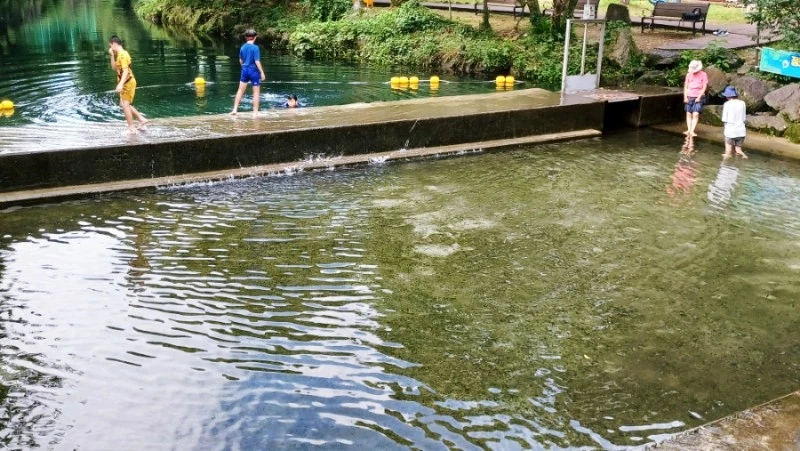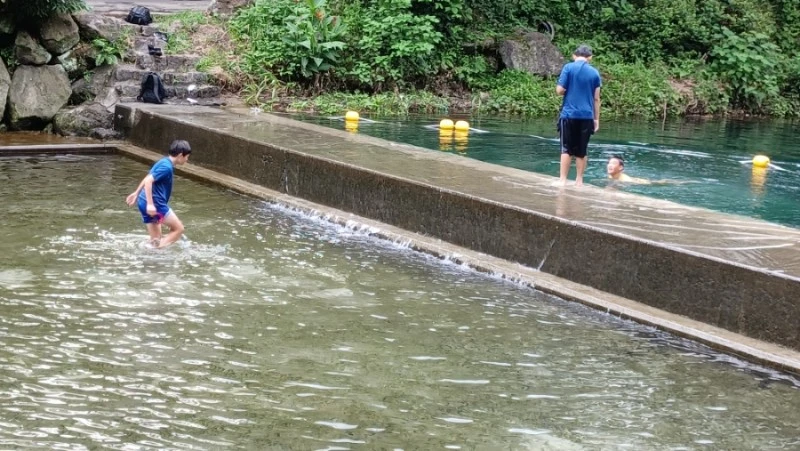 깨끗하고 안전한 담수욕장에서 아이들 신나게 함성 지르며 물놀이하고 어른들은 징검다리에 앉아 족욕 즐긴다.