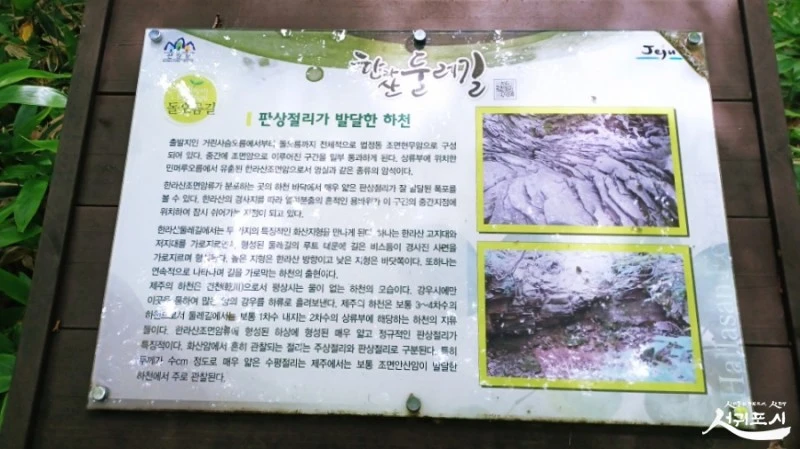 용바위에서 잠시 멈칫거린 다음 곶자왈처럼 어수선한 숲길 걷다 보니 이번엔 판상절리대 안내문이 나온다.