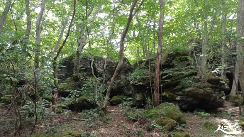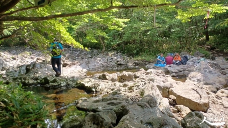 골바람 시원한 하천 너럭바위에 앉아 잠시 휴식 취한 뒤 숲길 오르니 이번엔 묘하게 생긴 용바위가 우측에서 꿈틀댄다.