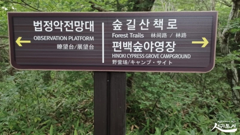 서귀포 자연휴양림 숲 사이로 난 데크길 산책로를 지나고 좌우로 들어선 편백숲 야영장도 스친다.