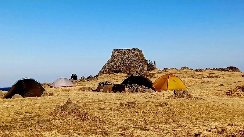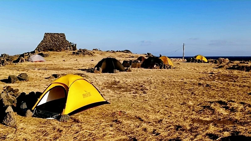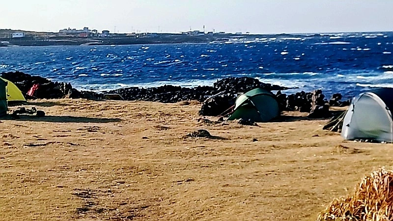 파도 철썩대는 바다 바로 곁 초지에서의 야영이