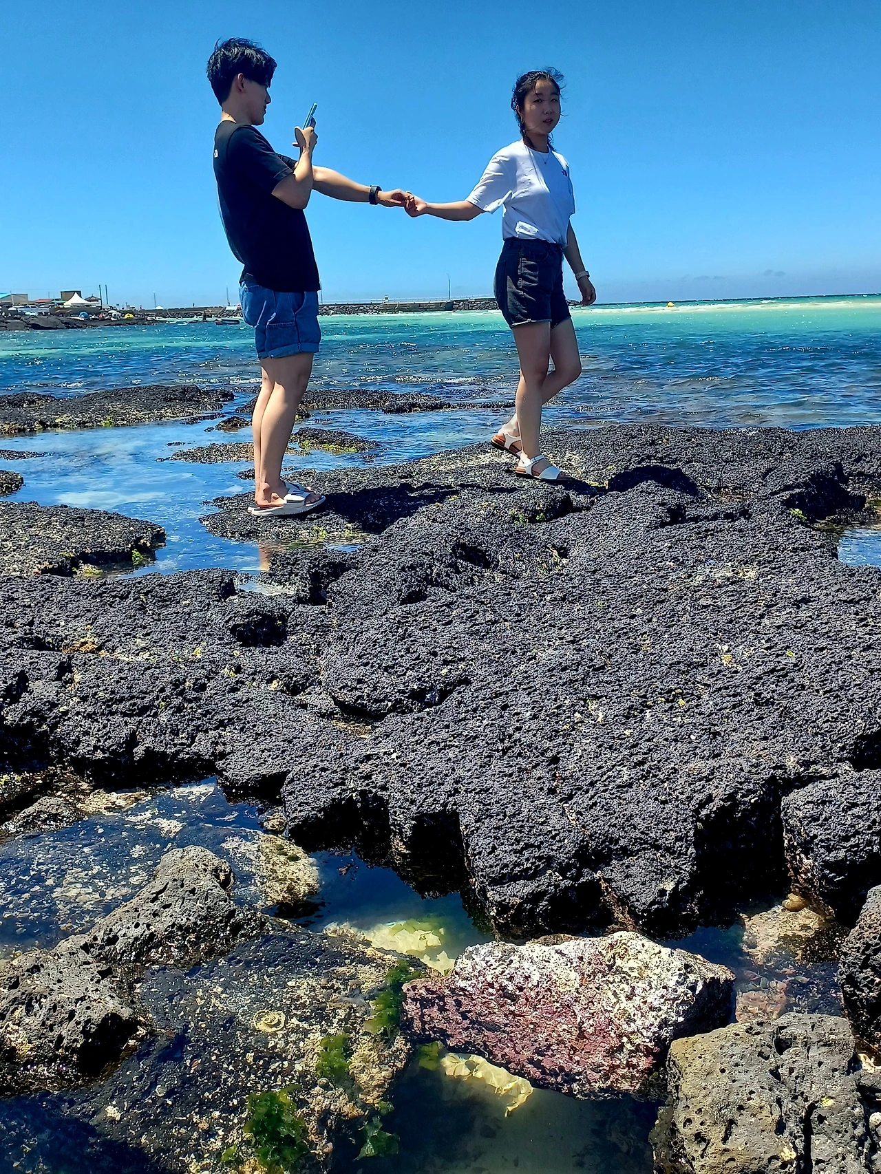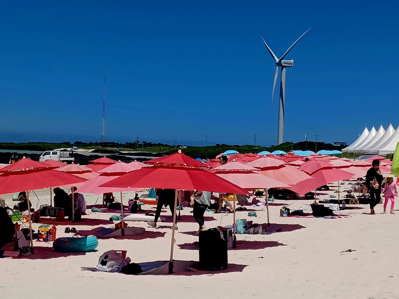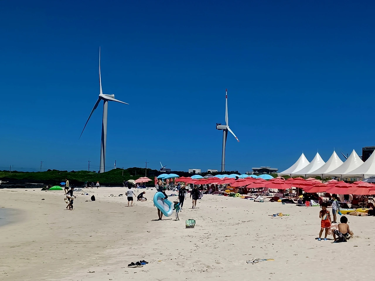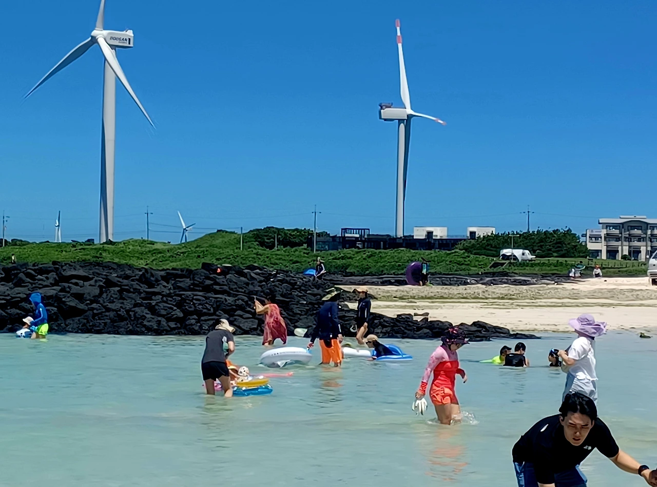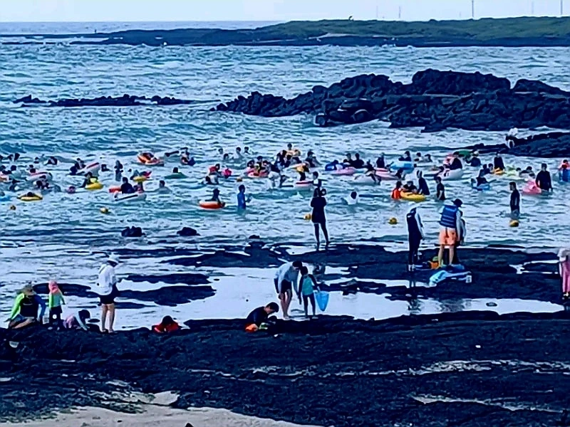 때마침 태양 이글거리는 쾌청한 날씨, 아이들은 방학을 맞았고 휴가철이라서인지 붐비는 피서객들로 활기를 띤 김녕해수욕장.