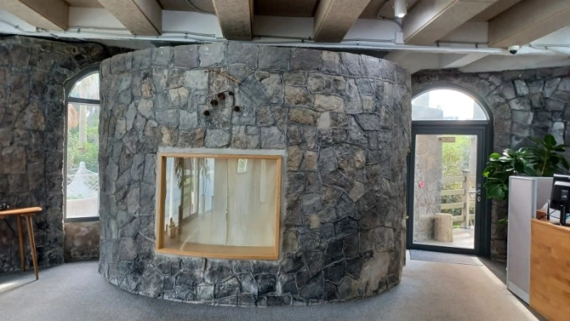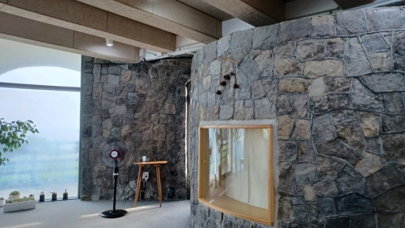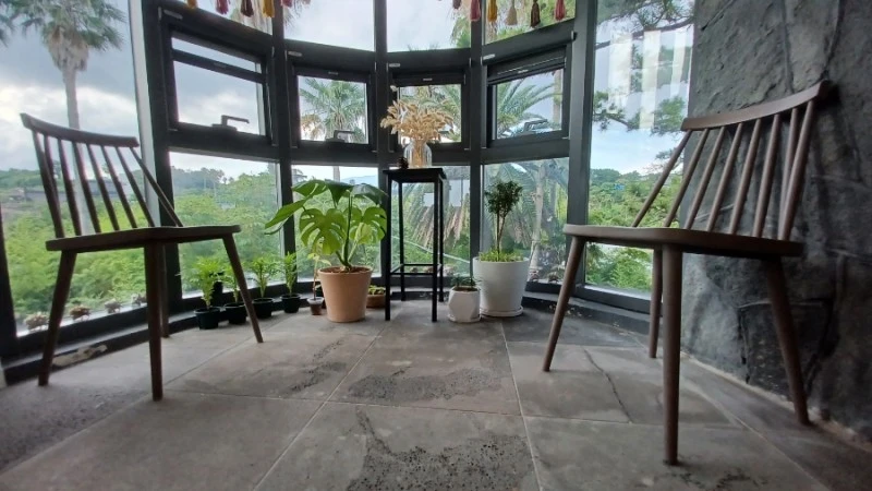 실내는 어쩐지 안온하게 쉴만한 별장 분위기이기보다는 지하 벙커처럼 묵직해 보였는데 현무암 석재가 주는 어두운 느낌 때문만은 아니리라.