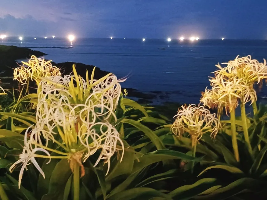 완전히 노을이 지자 먼바다에 어선 집어등 하나 둘 떠오르고 활짝 핀 문주란 곁 도심 불빛은 황금색으로 화려해졌다.