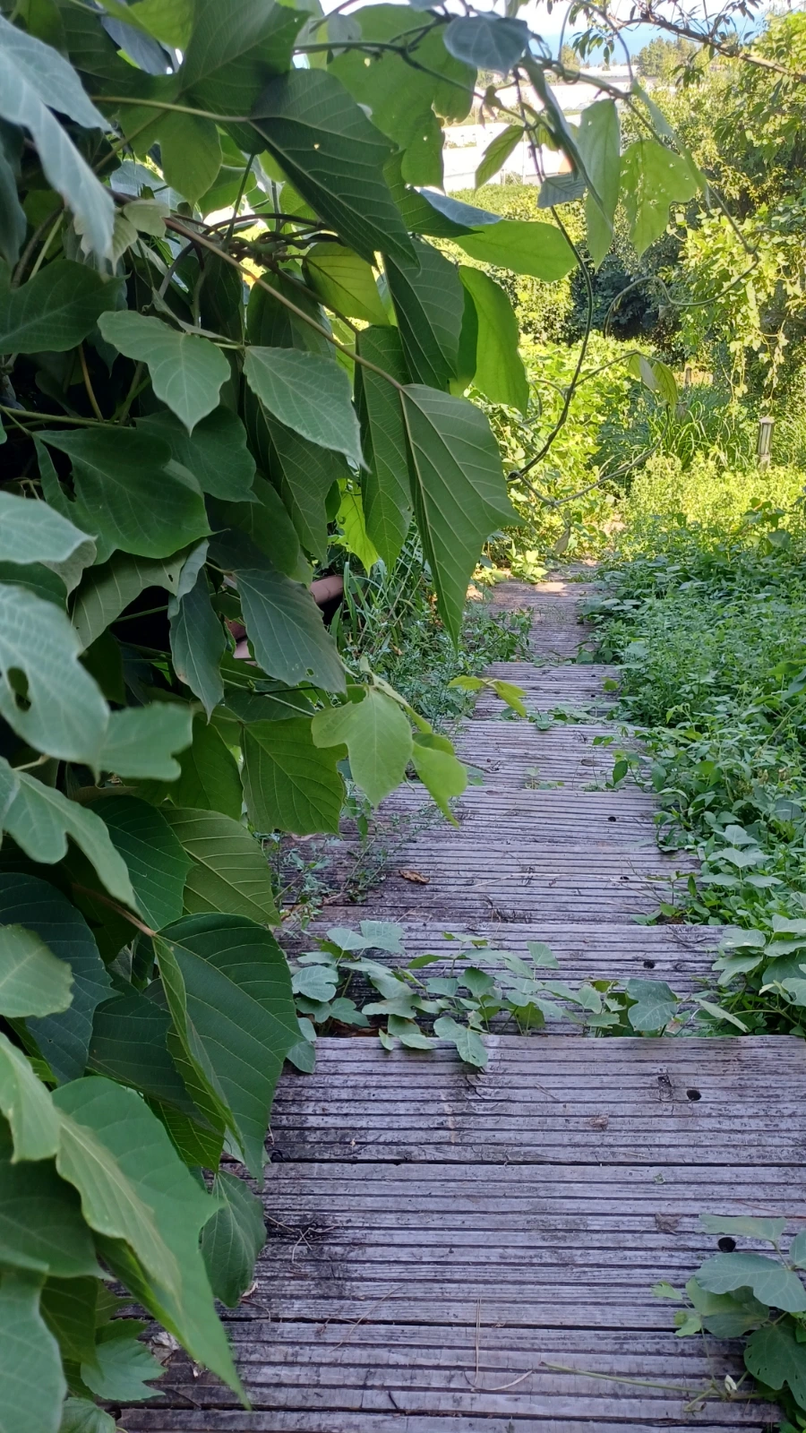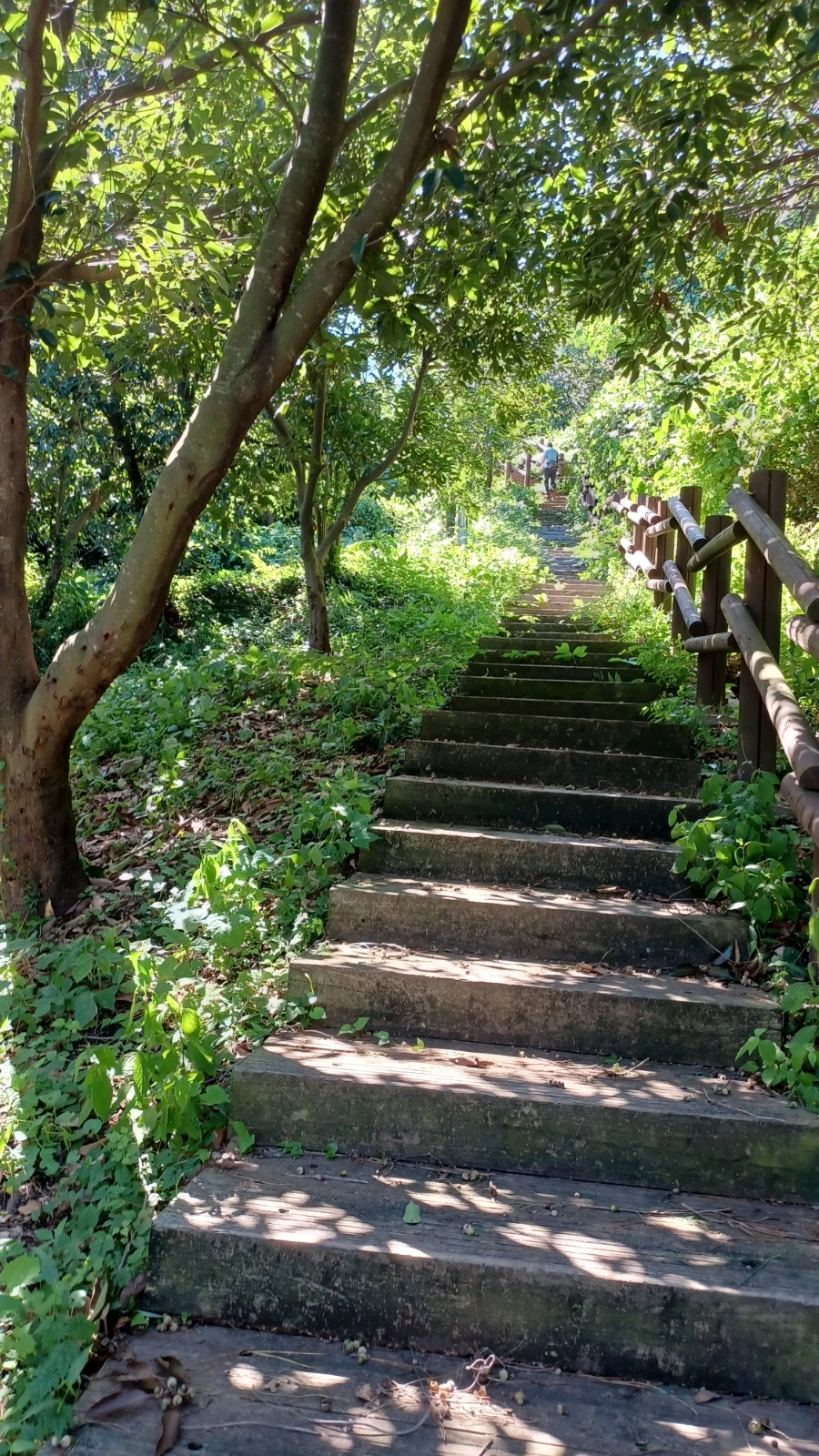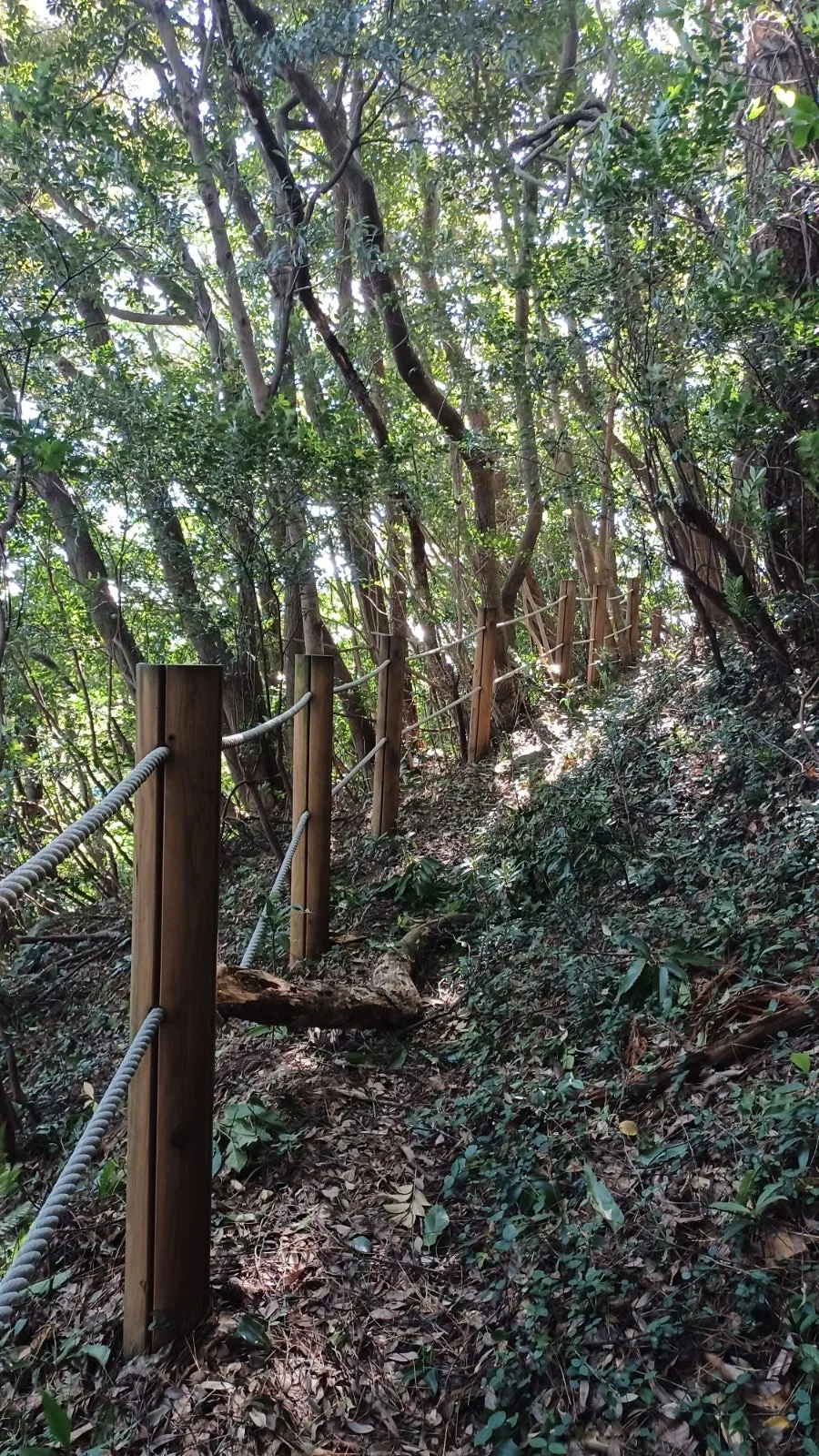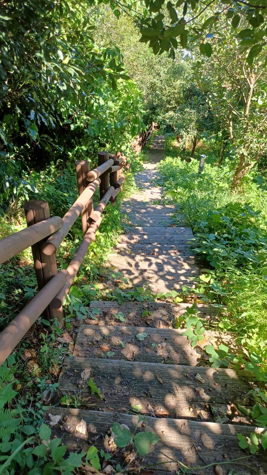 전망대에서 우측 계곡 산책로로 접어들면 숲길 어둑신하다.