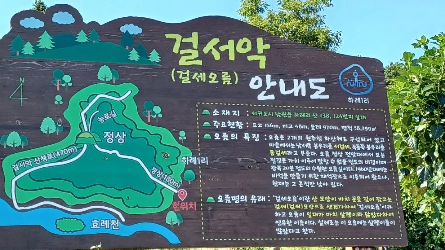 그중 걸세악은 표고 : 158m, 비고:48m, 둘레:970m, 면적:58,199㎥, 저 경:382m인 아름찬 오름인데 평야 가운데 솟아 우뚝해 보인다.