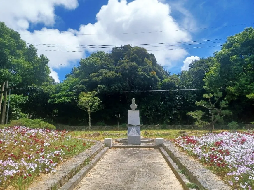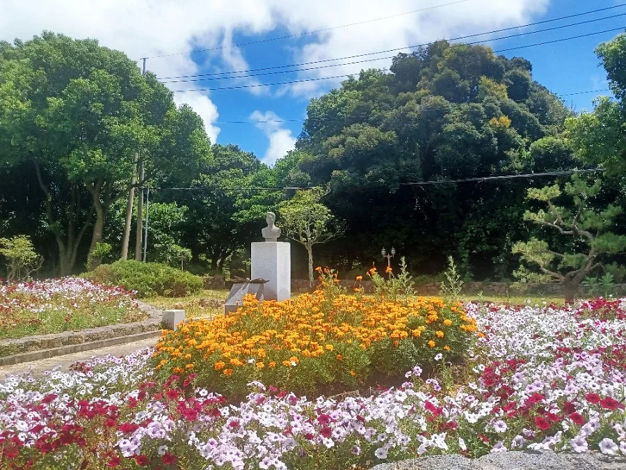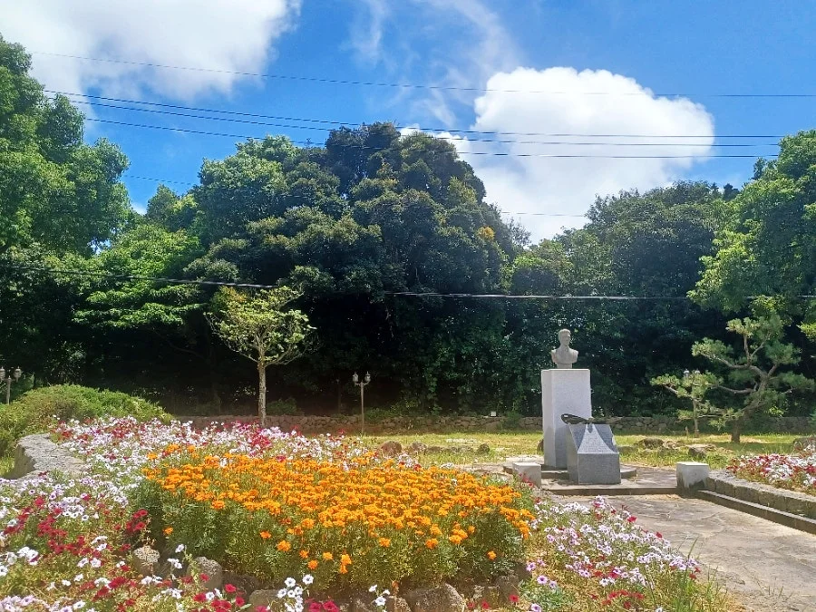 토평동 사거리 남동쪽에는 금송화 맨드라미 페투니아 꽃밭이 조성돼 있었고 중앙 기단 위의 자그마한 흉상이 눈에 띄었다.