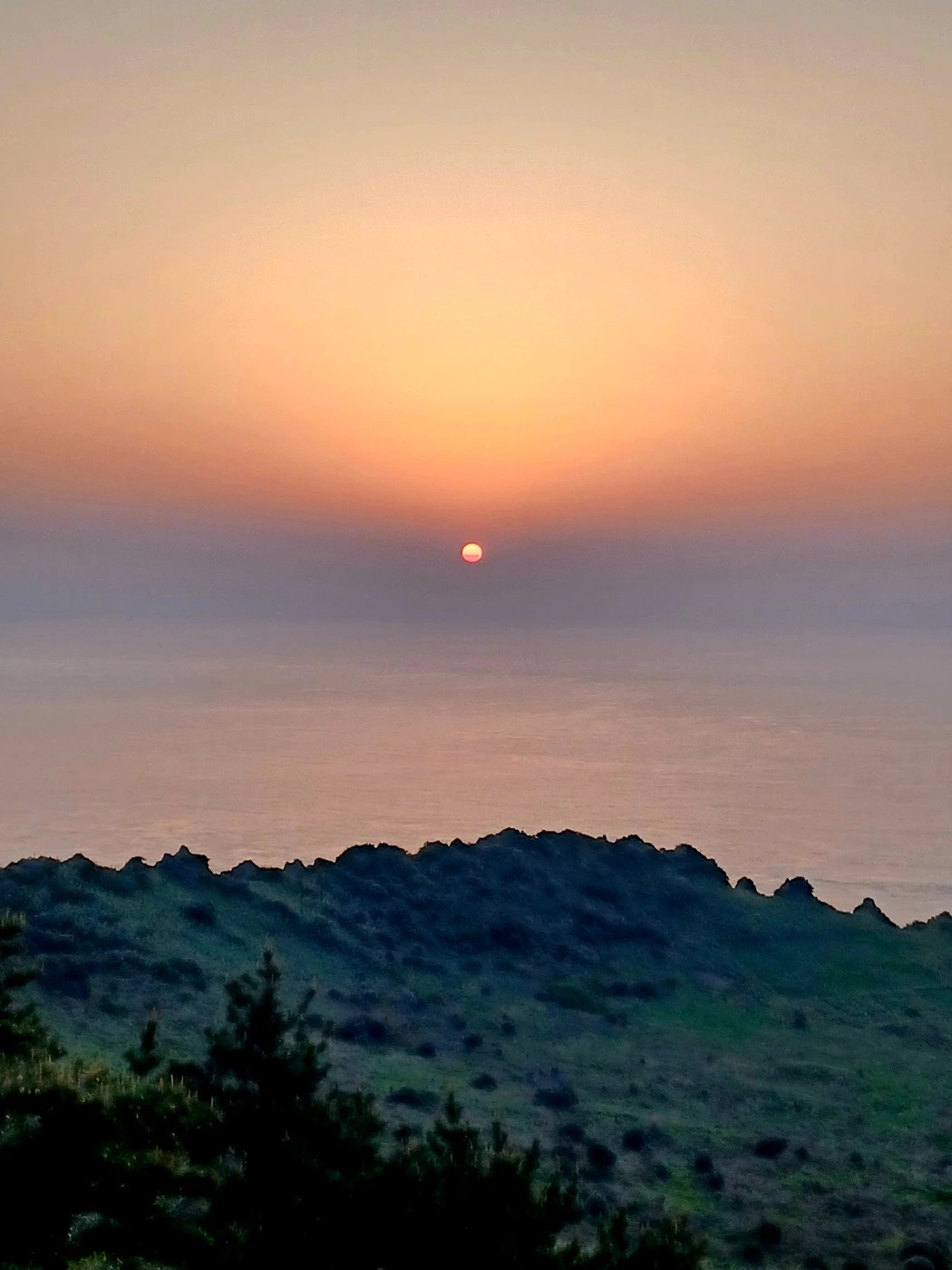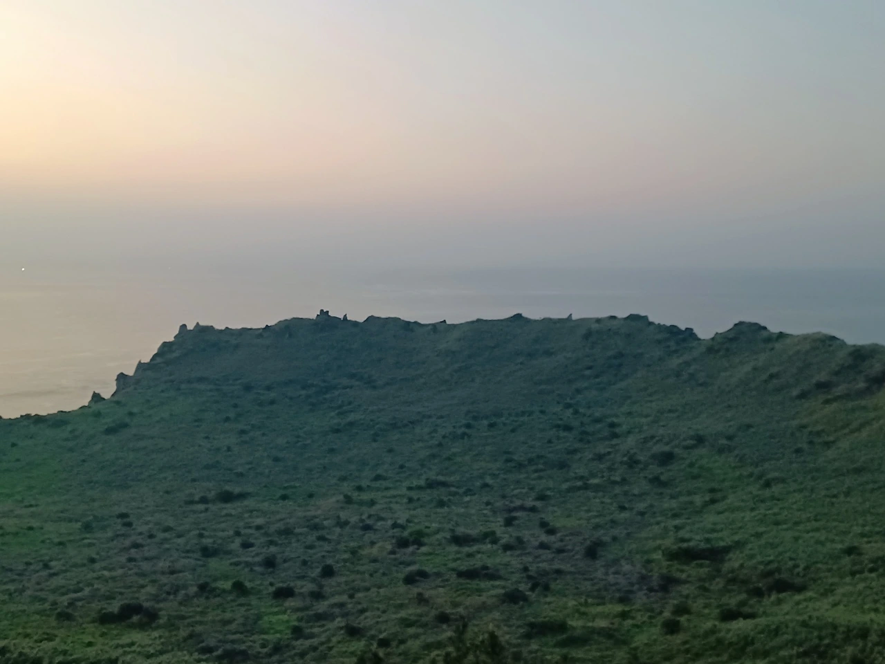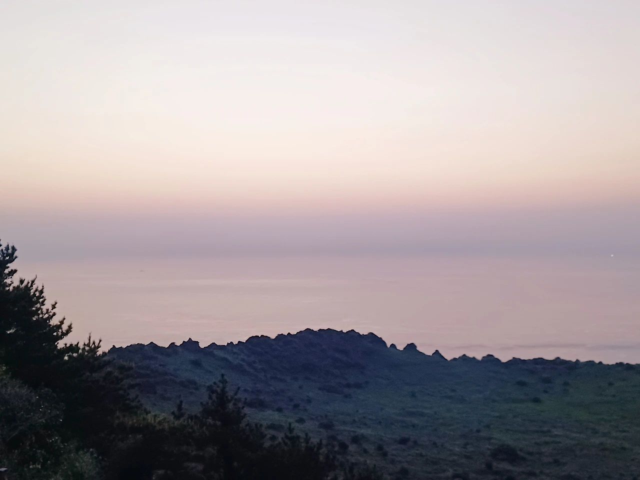 저녁 비행기로 제주를 떠나야 하므로 다음 날은 서쪽 해안을 돌아 공항으로 갈 예정이었다. 막 잠이 들려는데 딸이 내일 새벽에 해 뜨는 거 보러 성산 일출봉에 가자고 했다. 방금 일기예보를 확인해 본 결과, 다섯 시 58분에 일출맞이가 가능하다는 것. 네시로 알람을 맞춰놓았다. 알람소리에 화들짝 잠에서 깨어났다. 시차 때문인지 딸은 벌써 일어나 있었다. 옷을 따뜻하게 입고 깜깜오밤중에 집을 나섰다. 이미 카카오택시가 와서 기다리고 있었다. 휑하니 빈 도로를 질주해 다섯 시 30분 성산 주차장에 도착했다. 택시기사가 식사하며 기다리겠다기에 왕복 12만 원에 타고 가기로 했다. 예상보다 일출을 보러 온 사람들이 많았고 꾸역꾸역 돌계단을 올라들 갔다. 우리도 허위단심 산정으로 향했다. 55분에 딸내미와 나는 정상 층계에 나란히 앉아 일출을 기다렸다. 구름 한점 없이 밋밋한 동녘 바다에 불그스럼 홍조가 일기 시작하자 사람들이 웅성거리며 카메라를 눌러댔다.