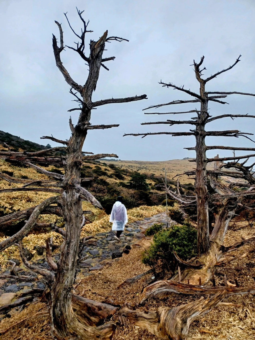 월요일, 아침부터 본격적으로 비가 내렸다. 봄비라 빗줄기는 부드러웠다. 어쨌거나 딸내미 미션의 첫 번째 목록인 한라산 등반이라 우비와 스틱을 챙기는 등 행장을 꾸렸다. 어제 아들이 동생에게 갈 때까지 렌터카를 쓰는 게 어떻겠느냐고 하자 딸내미는 반납시키라며 택시를 이용하겠다 하였다. 젊은애라서 곧장 앱을 깔고는 카카오택시를 불렀다. 영실 초입까지 5만여 원의 택시비가 나왔다. 결제를 하더니 딸내미는 와우, 너무 저렴하다며 무척 신기해했다. 폰에 달러로 찍힌 지출 금액을 보고 나 역시 신기하기만 했다. 그 당시 환율이 올 들어 최고였던 때라서 달러 쓸 맛이 났다. 그러나 아들은 박사과정생 손자한테 매달 송금해 주느라 허리 휠 텐데....