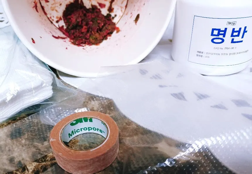 마침 치자물 염색을 들이느라 사놓은 백반이 있어서 봉숭아 재료를 찧을 때 적당히 넣었다.
