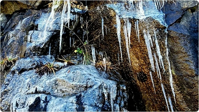 바스러질 듯 색 선연한 낙엽 소복 쌓였고 응달진 바위벽엔 줄줄이 고드름 맺혀있다.