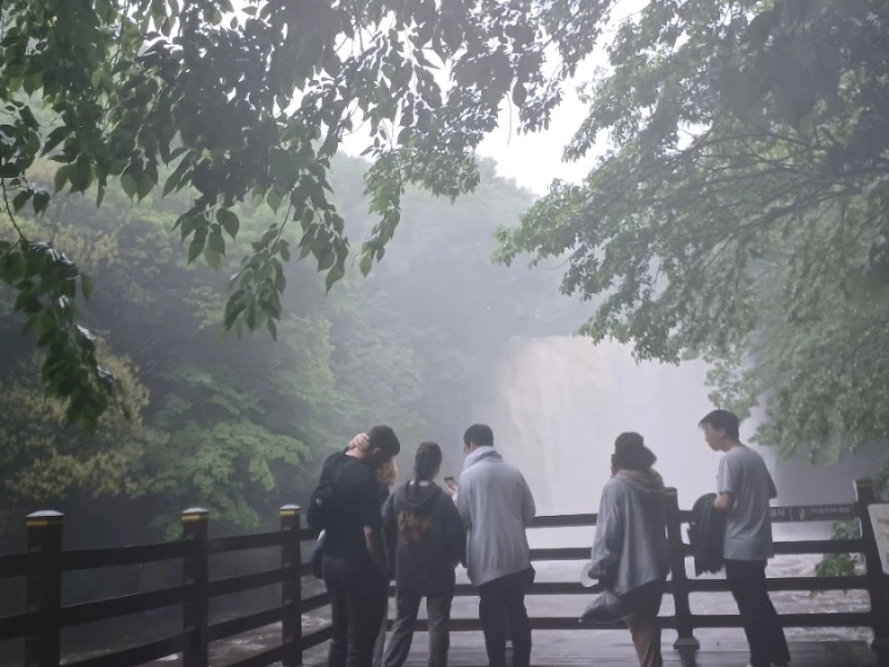 조심스러운 빗길 미끄러질세라, 난간을 잡으면서 살살 내려갔다. 여기도 요란한 물소리에 하얀 물보라 시폰 자락처럼 주변에 드리워 놨다. 귀엽기조차 하던 제3폭포는 그만 과체중 비만아가 되었다.