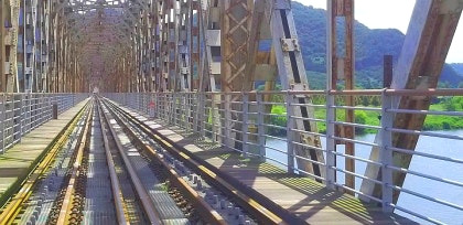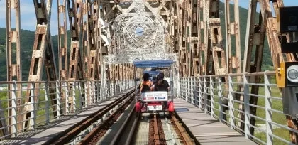 레일바이크의 총 구간은 왕복 3㎞, 발아래 시퍼런 낙동강이 흐르고 녹슨 철조 구조물들이 휙휙 빠르게 스치는 사이사이로 멀고 가까운 좌우 조망권도 일품인 곳이다.