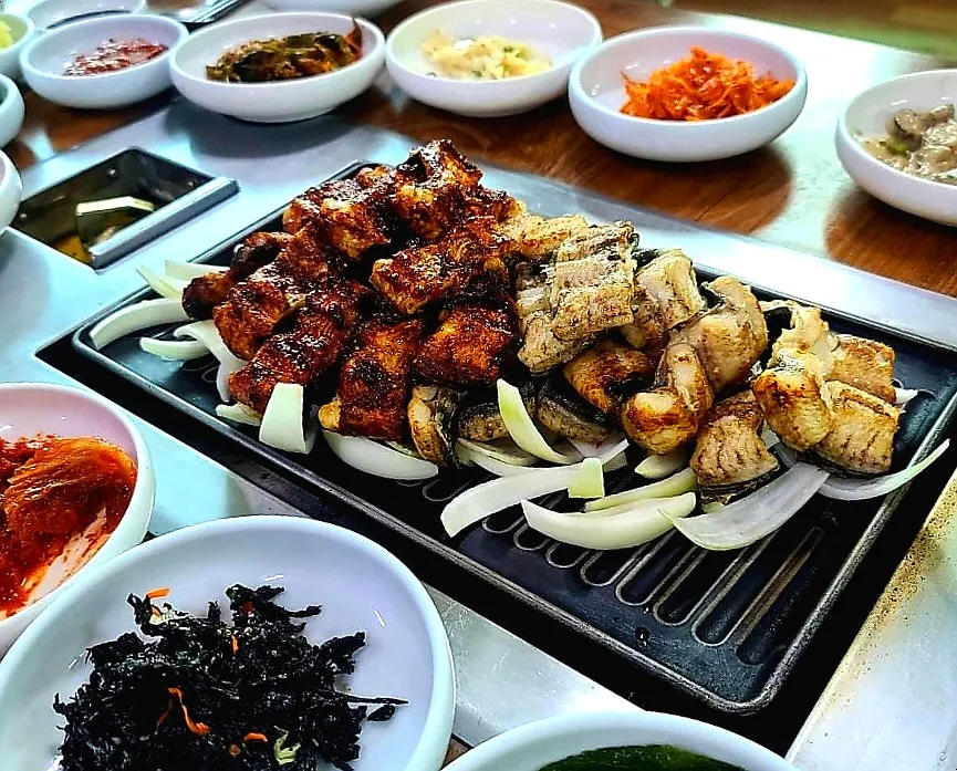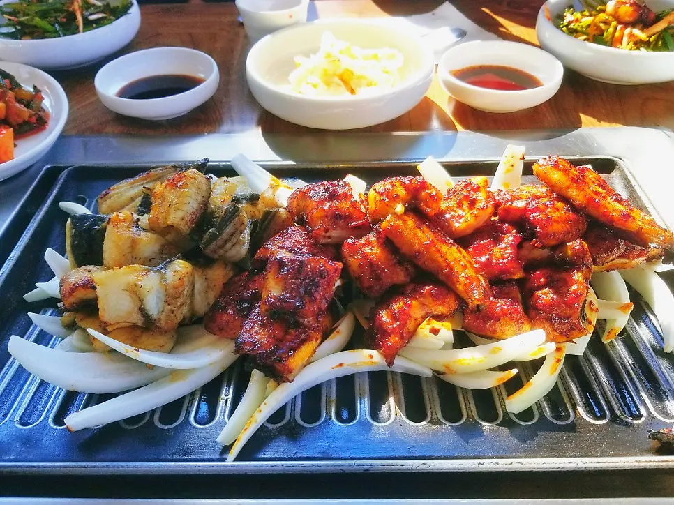 양파 채를 깐 불판에는 장어 양념구이와 소금구이가 반반씩 숯불에 지글지글.