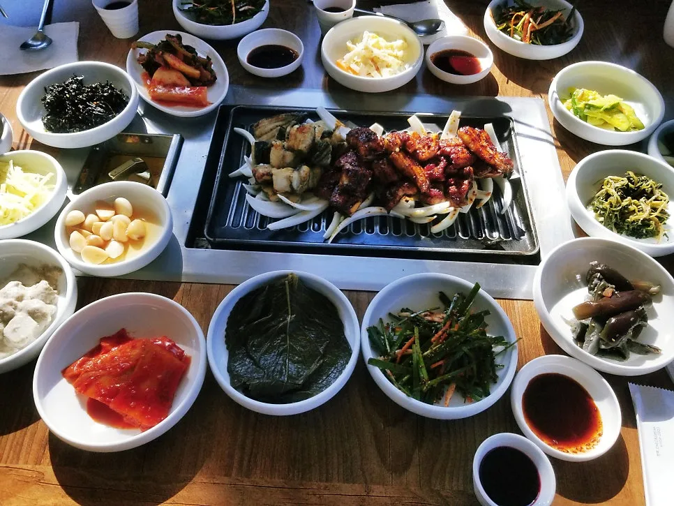 풋고추 마늘 상추, 부추겉절이, 죽순, 가지, 산채 무침, 깻잎지 정갈하고 맛깔진 밑반찬에 먹음직스러운 묵은지도 나왔고요.