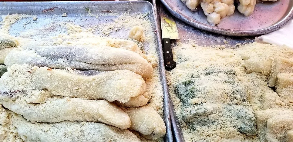 시장 입구에서는 국화빵을 구워내고 떡판 위의 인절미를 썰어 팔며 그 옆에선 도넛을 튀긴다.