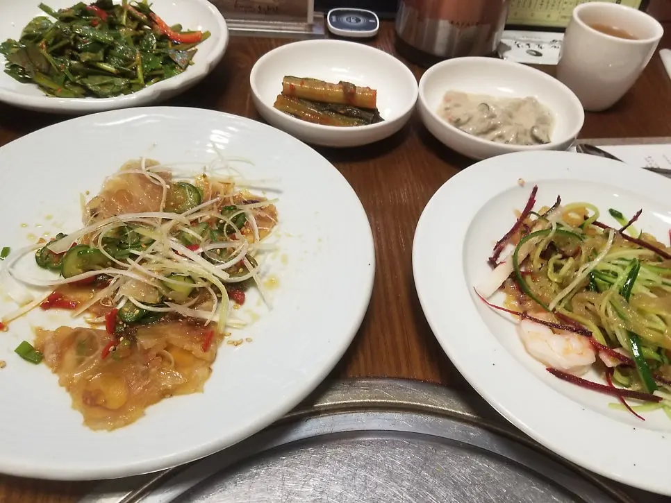 연어탕수 해파리냉채 전통잡채 청포묵 홍어야채찜 오징어볶음 불낙전골 삼합 철판황태구이 갈비찜 가자미찜 피클 물김치 버섯찜 나물무침....