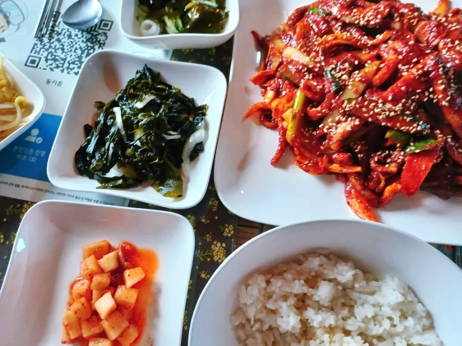 끝으로 맑은 된장국에 가까운 뚝배기와 동카름의 주인공, 큰 접시에 수북 담긴 낙지볶음이 등장했다.