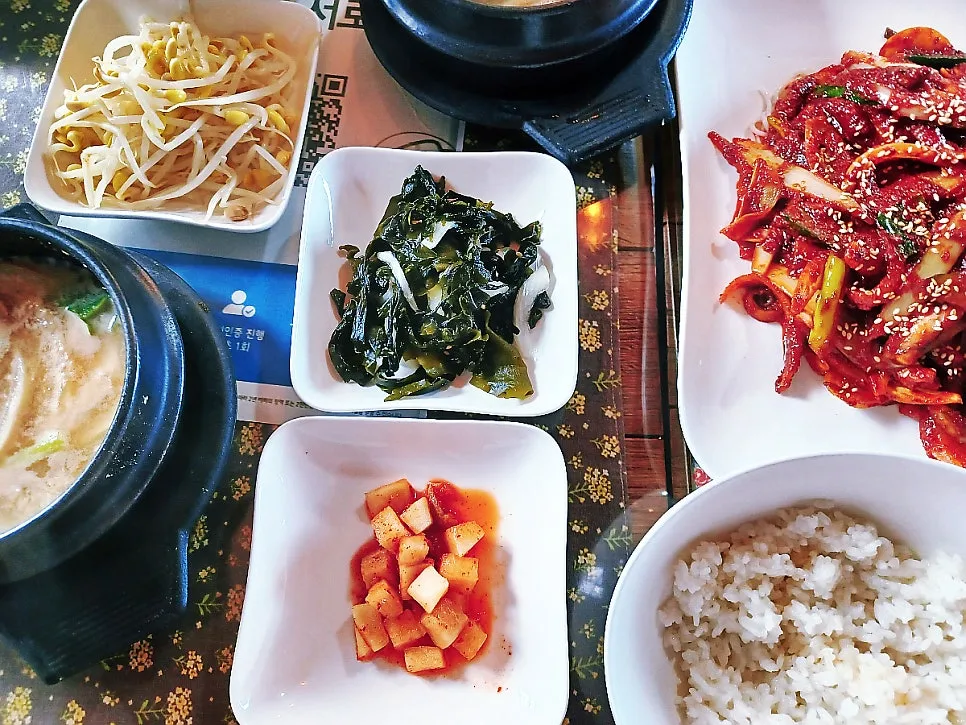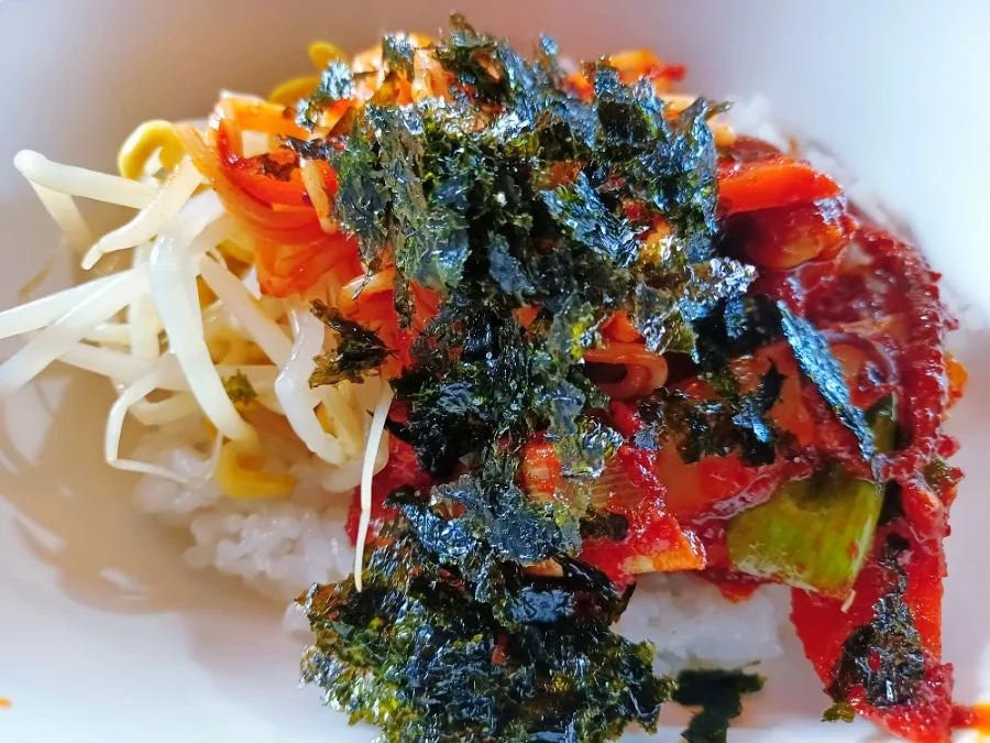 알고 보니 양념 안된 콩나물은 매운맛을 중화시켜 주는 용도요, 기호에 따라 미역무침을 얹어 비비면 비주얼 더 그럴싸했다.