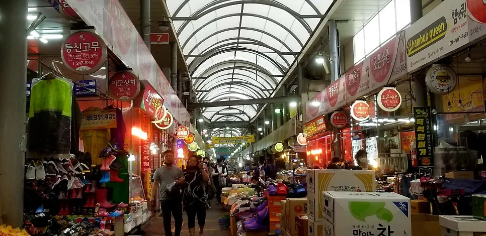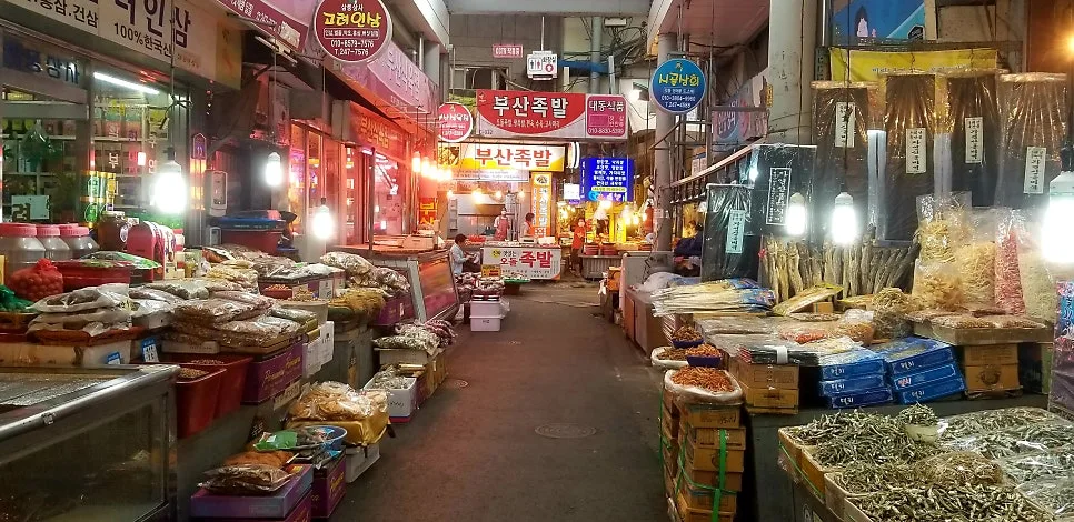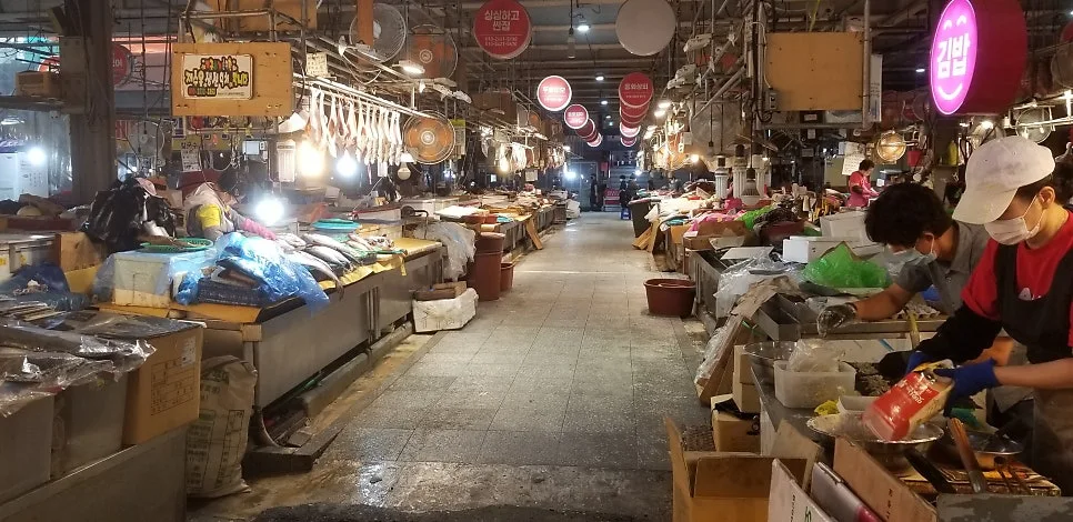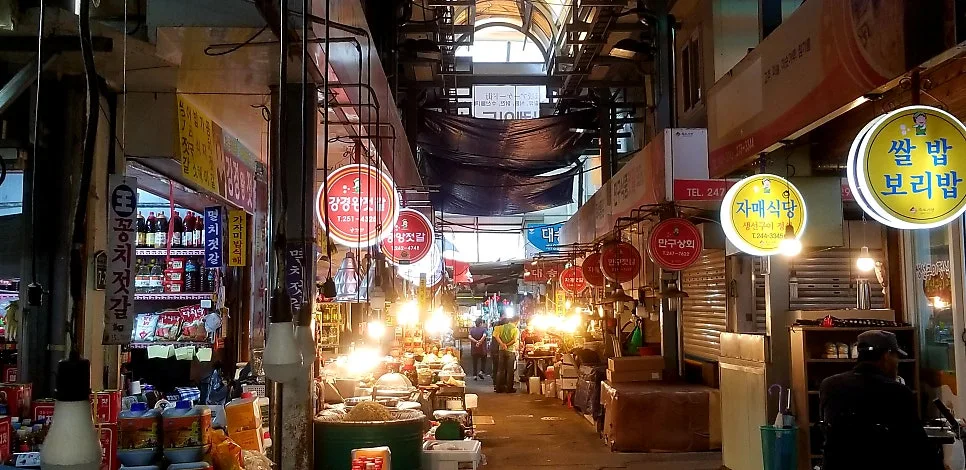 동해안 최대의 전통시장으로 수산물 농산물 건어물 과일 잡화상이 빼곡하고 골목마다 특성화된 식당 밀집지역으로 이름난 이곳.