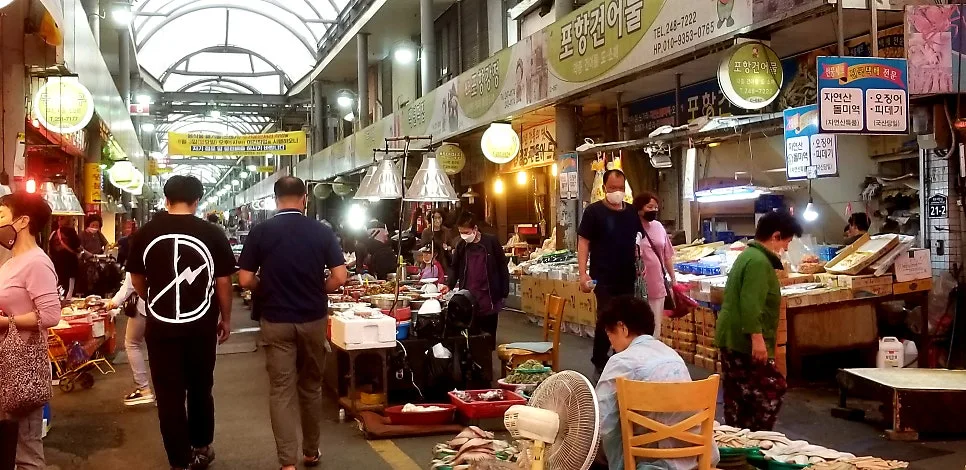 영일만을 끼고 있는 포항이라 시장통에는 대형 물회집, 대게집, 고래고깃집이 주를 이룬 한편 소문난 소머리곰탕집, 보리밥집, 칼국수집도 유명하다.