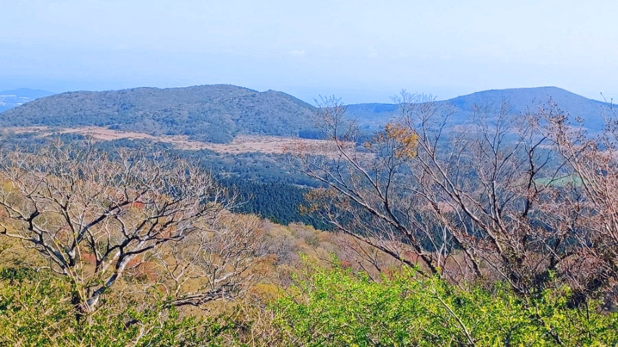 측면에는 절물오름 거친오름 물장오리오름 견월악이 연두색 보자기를 펼쳐놓은 듯한 목장 초지를 둘러쌌다.