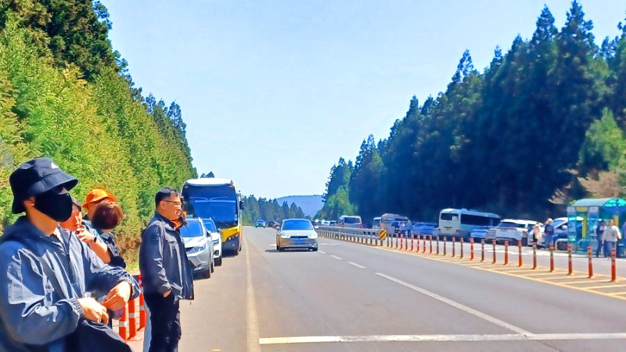 버스 한 코스만 더 가면 덜 붐비는 붉은오름 자연휴양림이 기다리니 그쪽에서 오르기로 하였다.