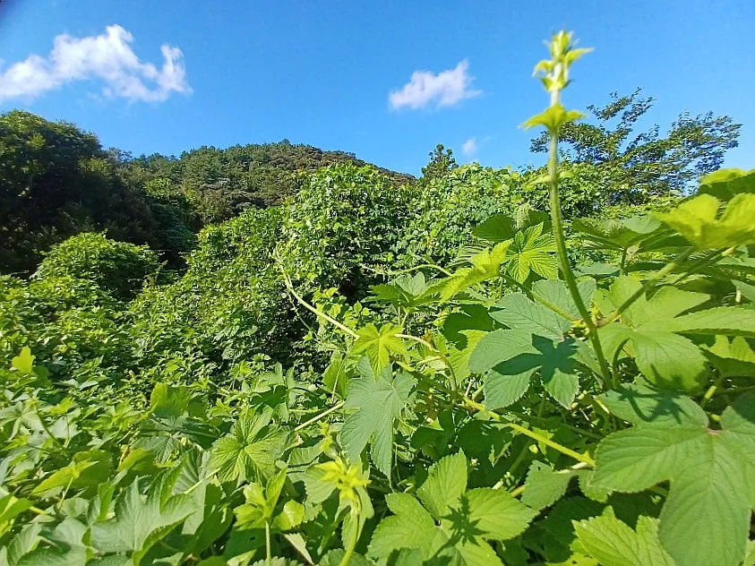 너도 칡덩굴? 한여름 길섶이나 공터 어디에서건 마냥 영역 넓혀가는 환삼덩굴은 줄기에 미늘형 잔가시가 들어차 자칫 건들면 클난다.