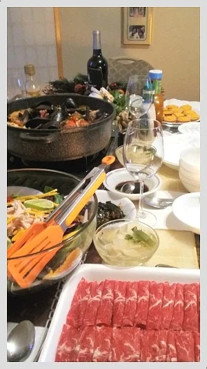 식탁 중앙에 개스 불판을 약하게 켜고 전골냄비를 덥혔다.